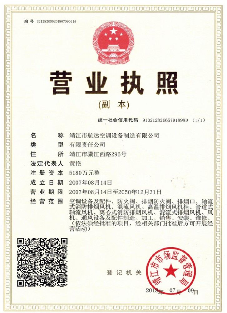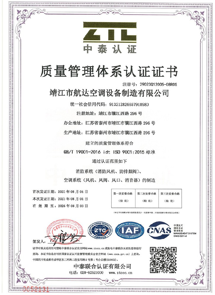 靖江市航達空調設備制造有限公司位于長三角經濟地帶、長江之濱江蘇省靖江市,現有京滬高速、新長鐵路南北貫穿靖江市區兩側,交通十分便捷,物流業發達。 公司主要產品有:防火閥、排煙防火閥、排煙閥、板式排煙口、軸流(混流)式消防排煙風機、離心式消防排煙風機、組合式空調器、變風量空調器系列、風機盤管系···…