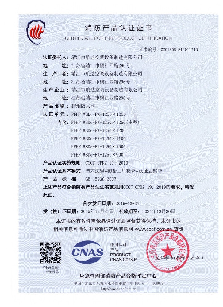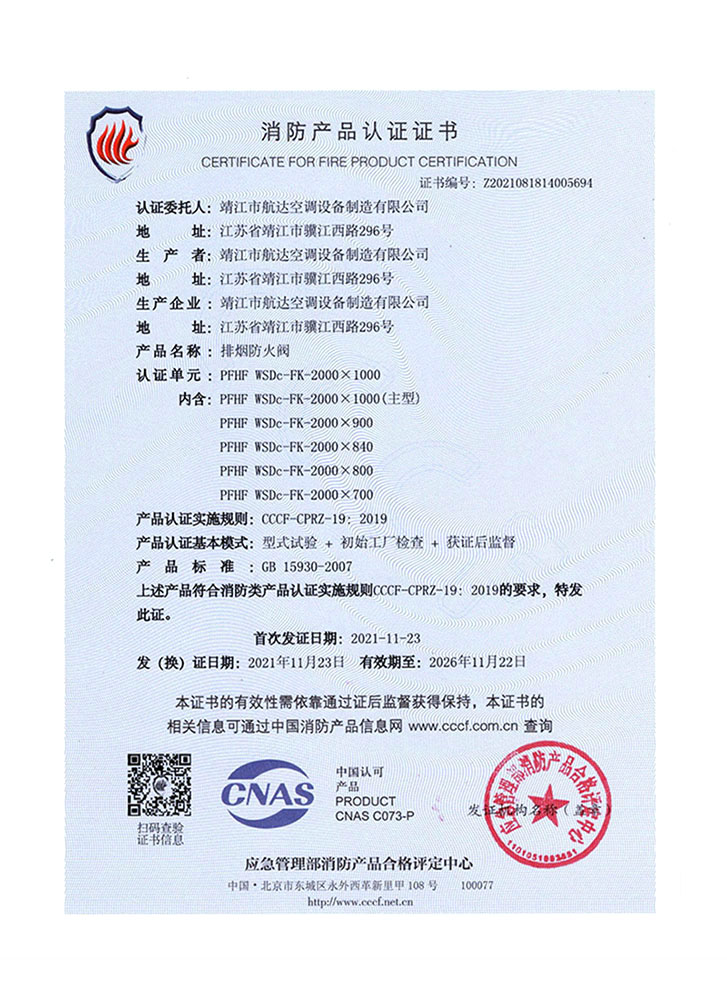 排煙防火閥證書